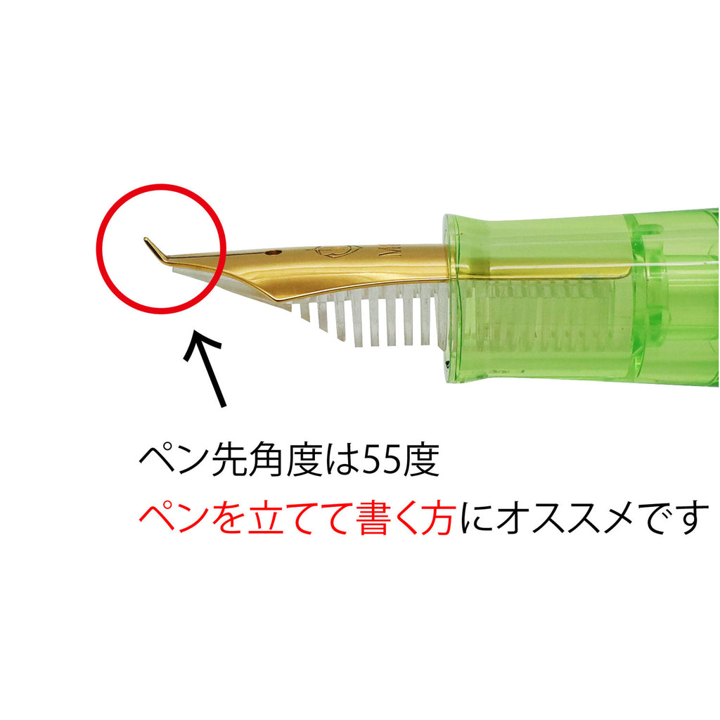 ペン先を立てるとより細字に、ペン先を寝かせるとより太字に、筆記角度により文字の太さを自由に変える事ができます。
